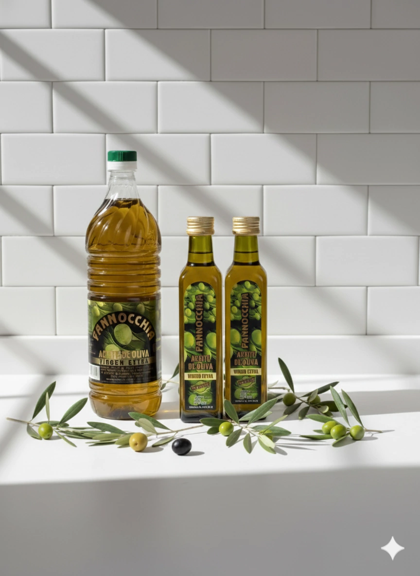 Caja con 4 botellas de 1 litro envase Pet + 2 botellas x 500 cm3 Vidrio (5 litros en total) de aceite de oliva virgen extra Pannocchia.